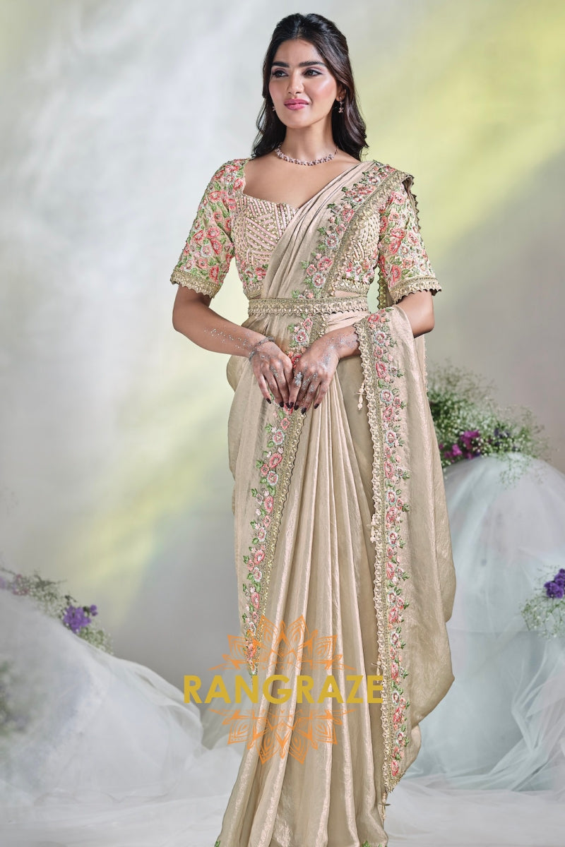 Blush Beige Bloom: Ready-to-Wear Designer Embellished Saree