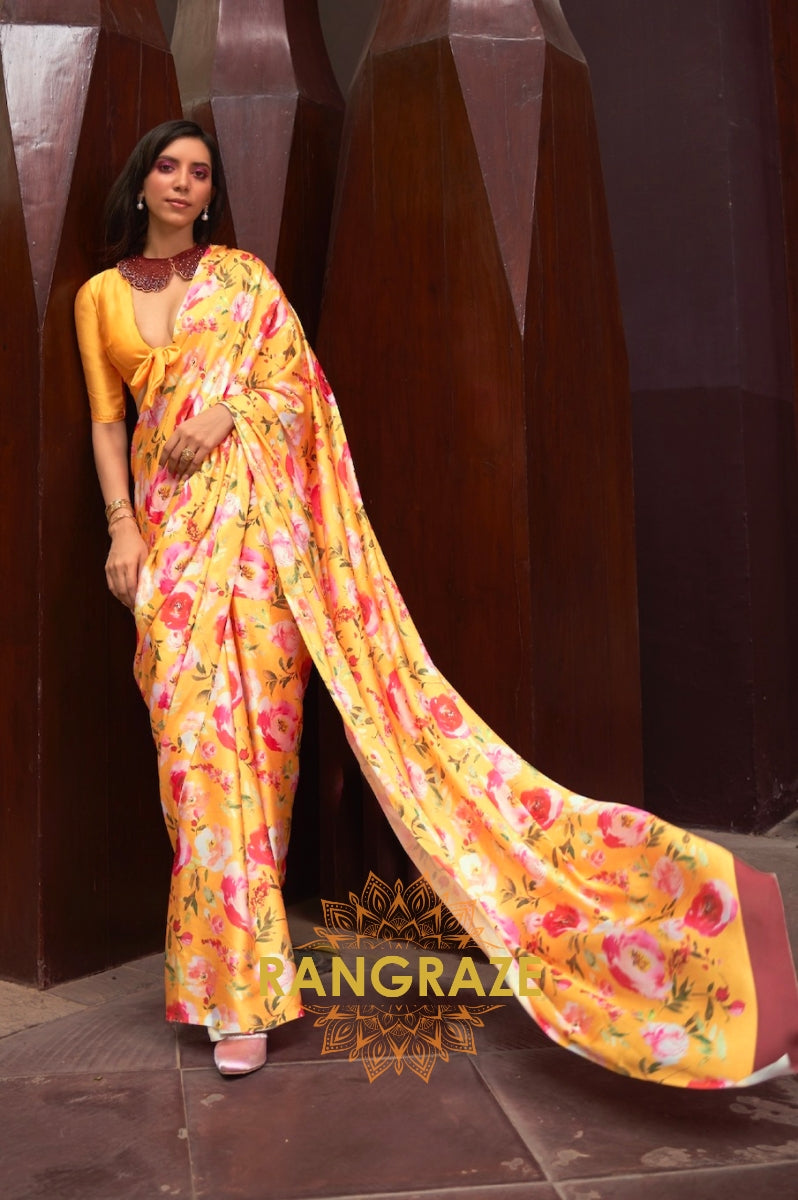 Canary Yellow Floral Print Satin Silk Saree