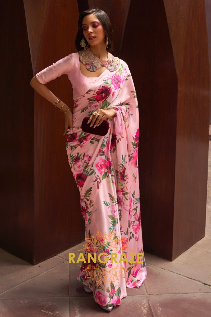 Baby Pink Floral Print Satin Silk Saree