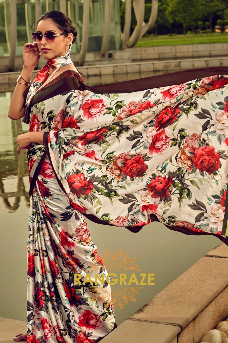 The Classy Red and Green Floral Printed Satin Silk Saree is a timeless and sophisticated...