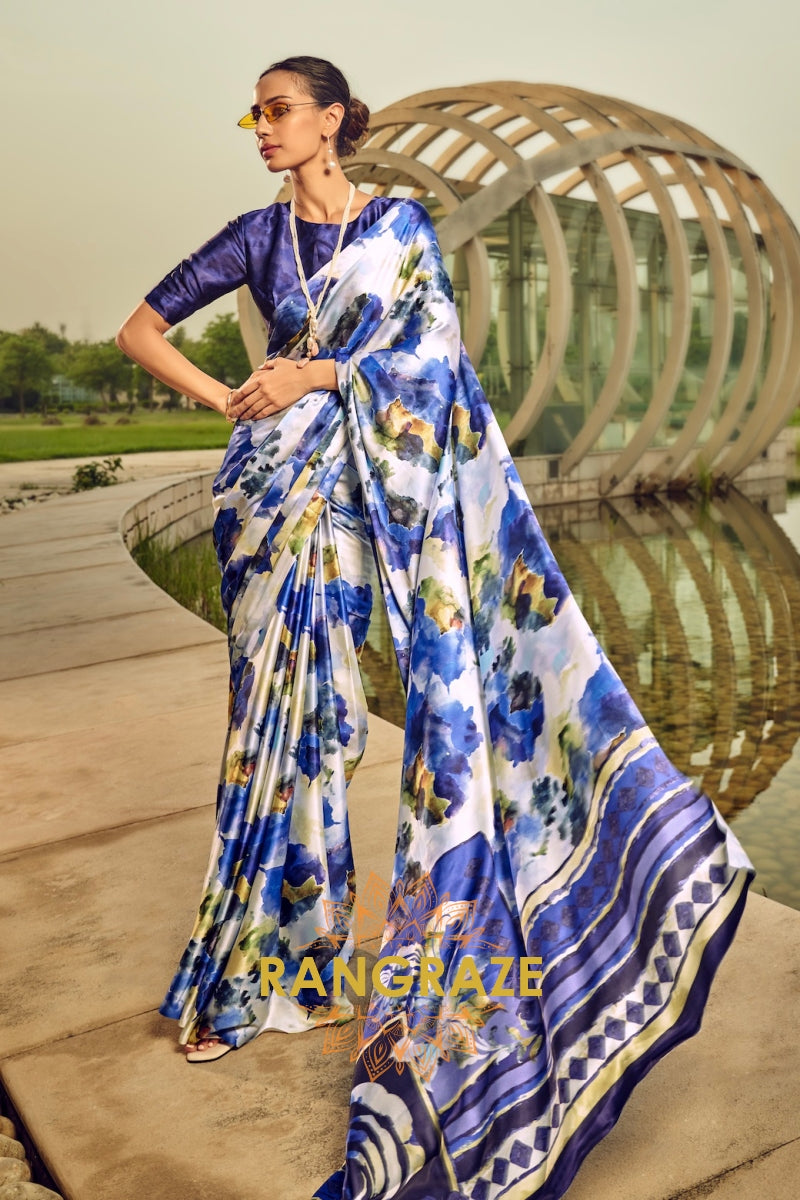 Azure Blue Floral Printed Satin Silk Saree