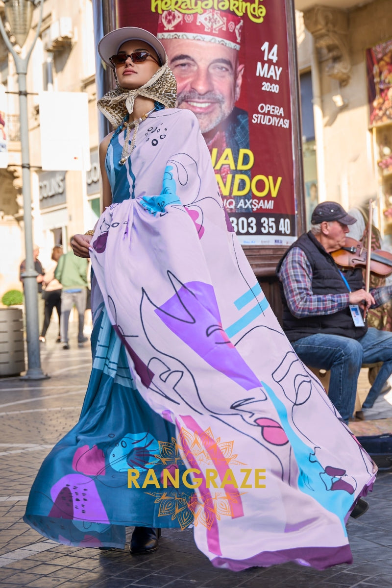 Indulge in modern elegance with this Aqua and White Abstract Printed Satin Crepe Saree, a...