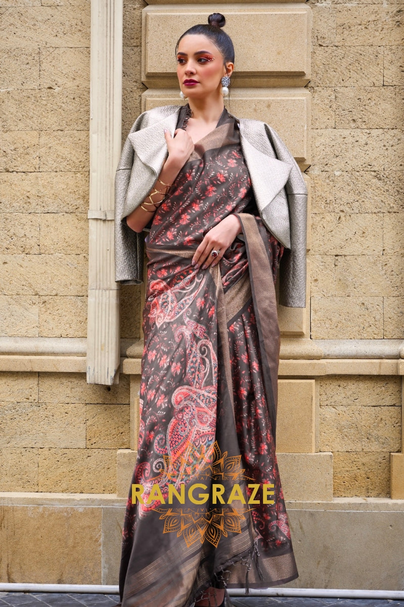 Brownish Black Floral Pure Gajji Silk Print Handloom Weaving