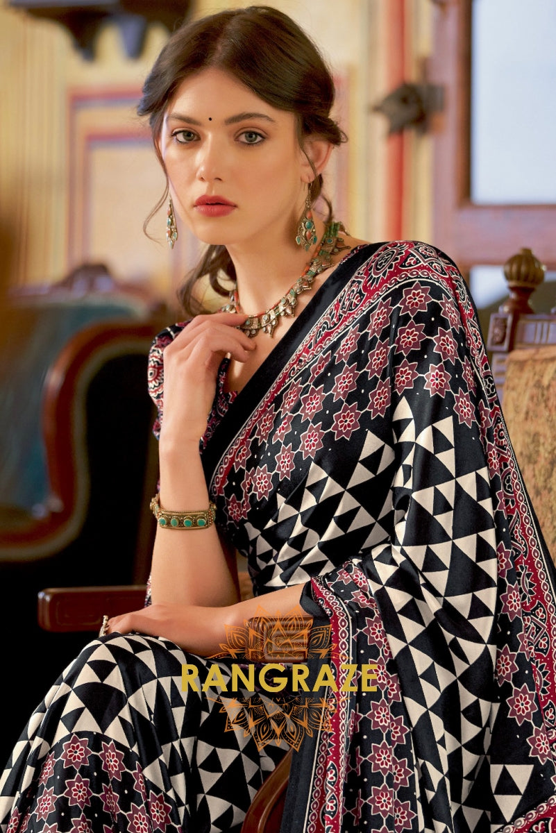 Classic Black Satin Silk Ajrakh Print Saree