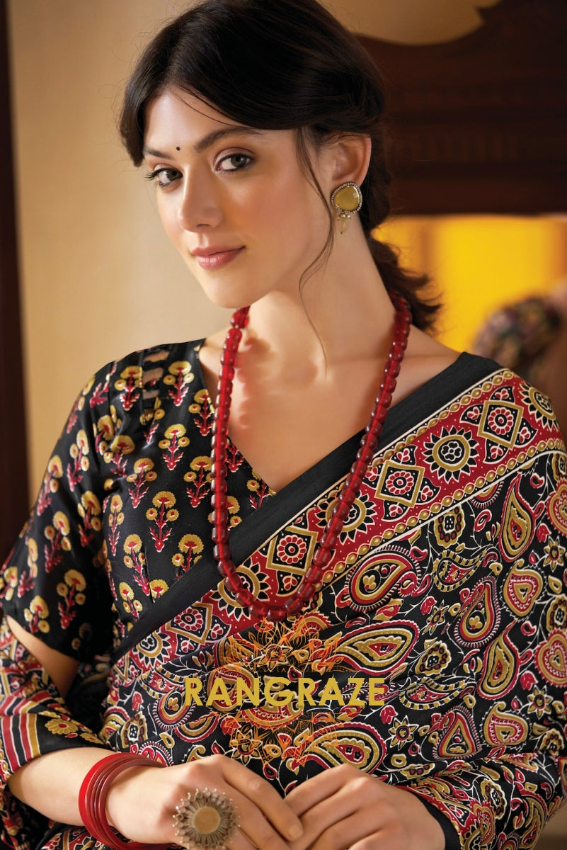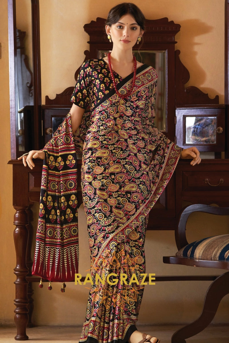 Black Red Ajrakh Printed Satin Silk Saree