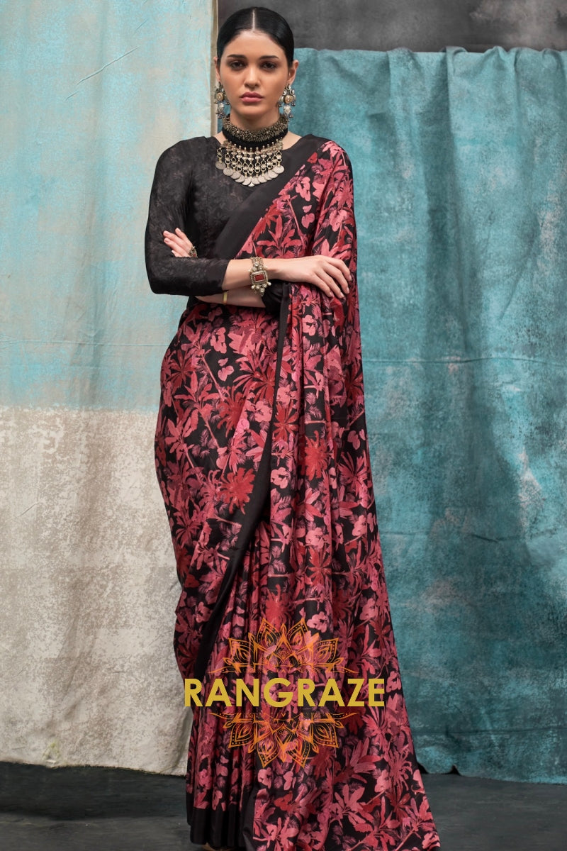 Elevate your style with this Elegant Black and Red Floral Printed Satin Crepe Saree, a...