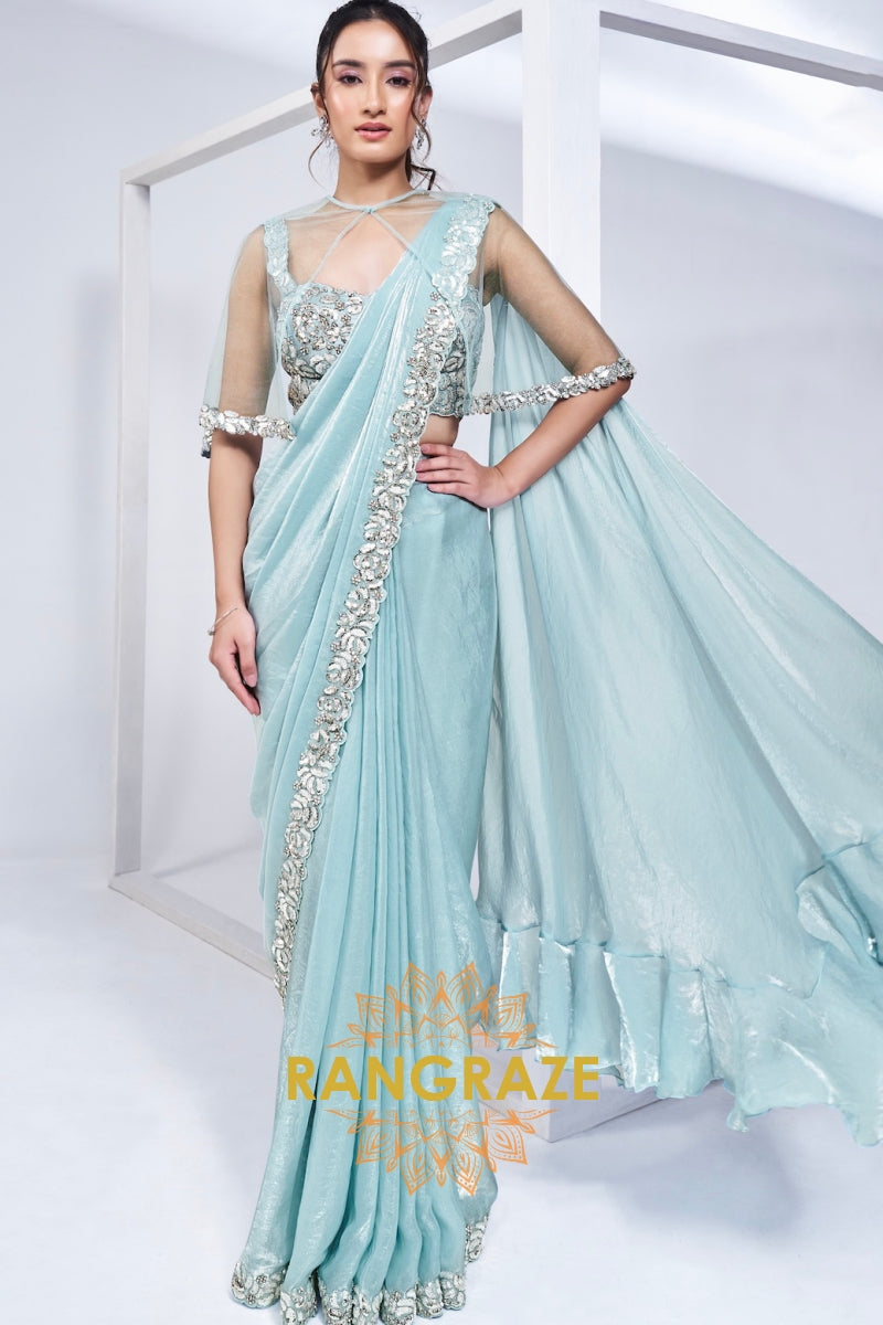 Aqua Glam Ready-to-Wear Saree with Hand Embroidered Blouse and Poncho
