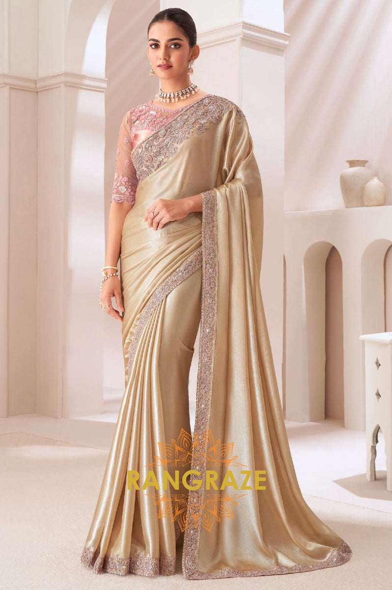 Step into elegance with this Golden Beige Designer Saree adorned with intricate embroidery. The luxurious...