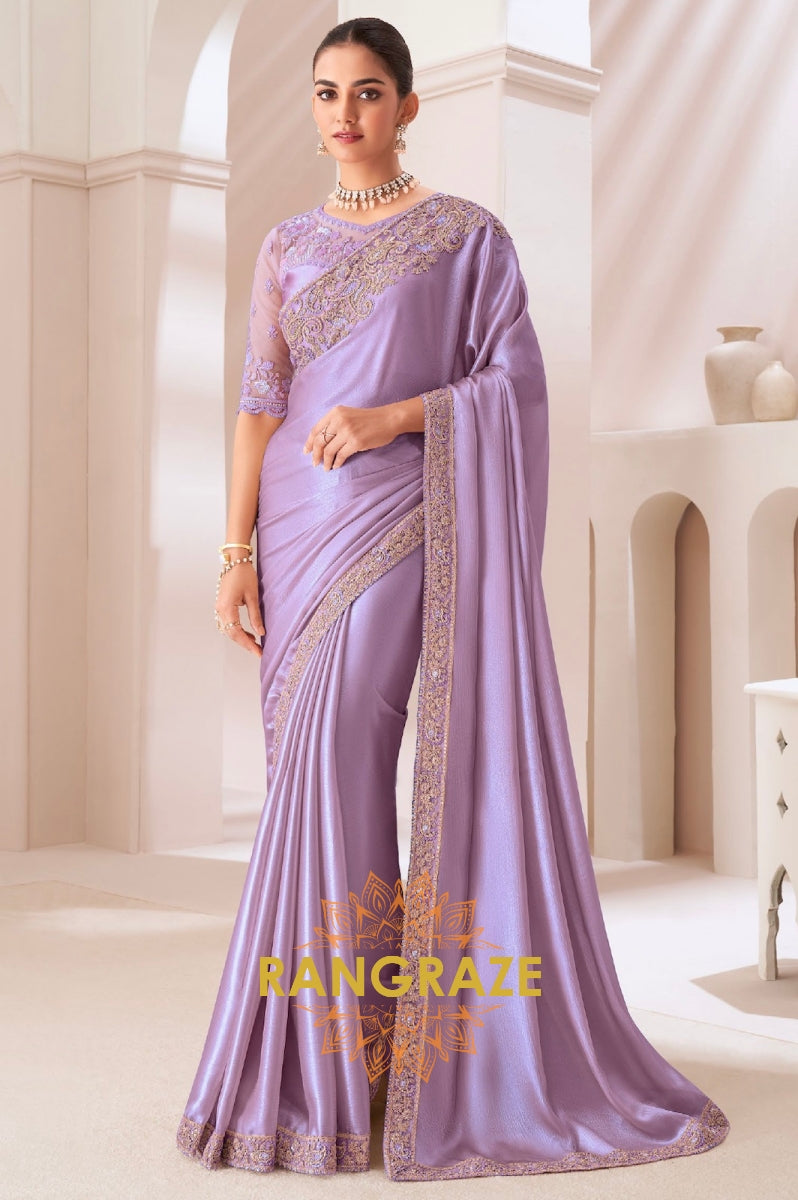 Embrace timeless elegance with this Regal Amethyst Satin Chiffon Saree, a masterpiece of sophistication and...