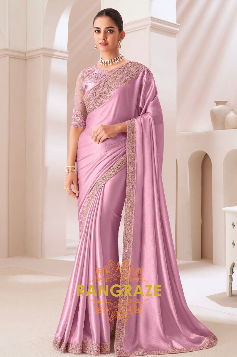 Sparkling Pearly Pink Soft Satin Silk Print Saree