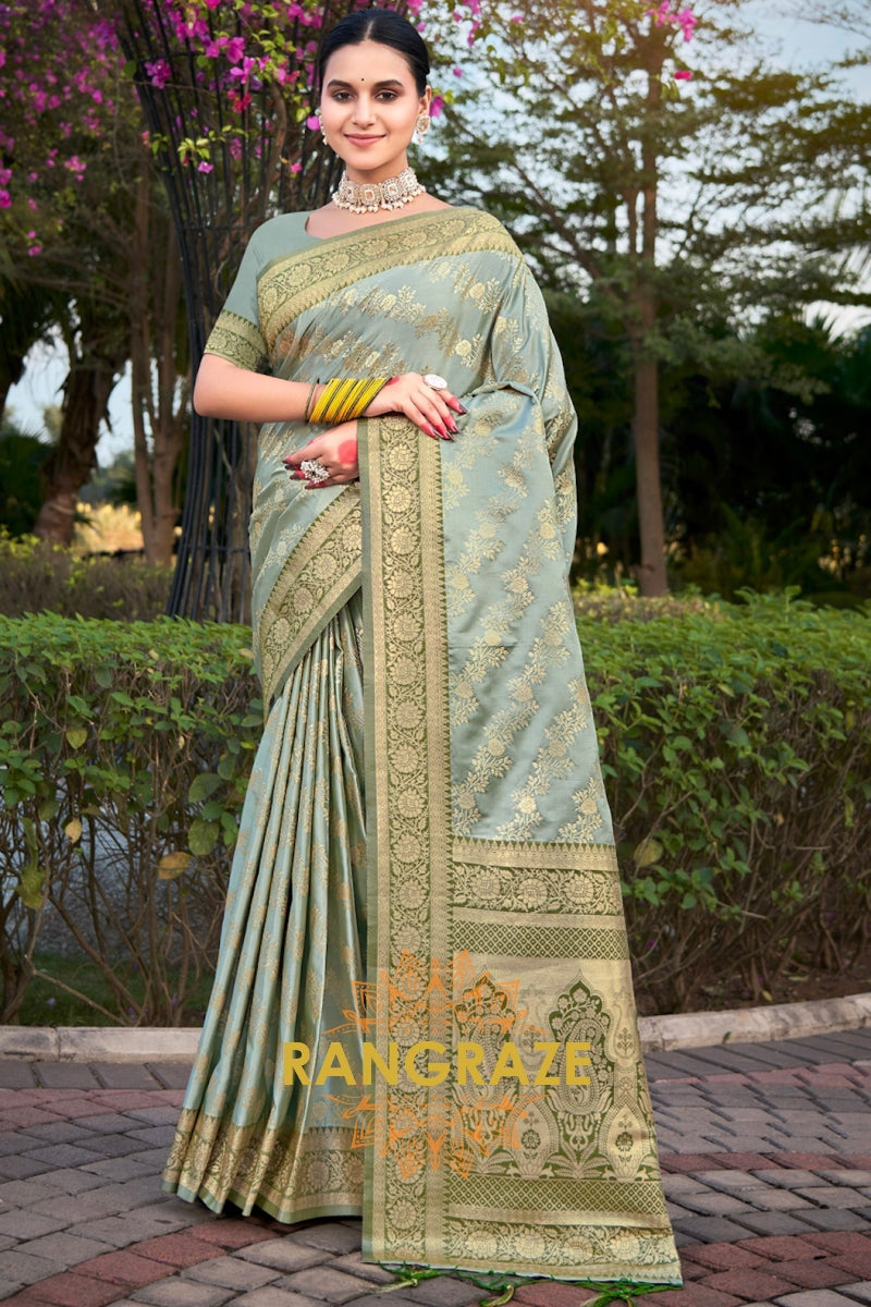 Grand Golden Grey Woven Banarasi Golden Zari Satin Silk Saree