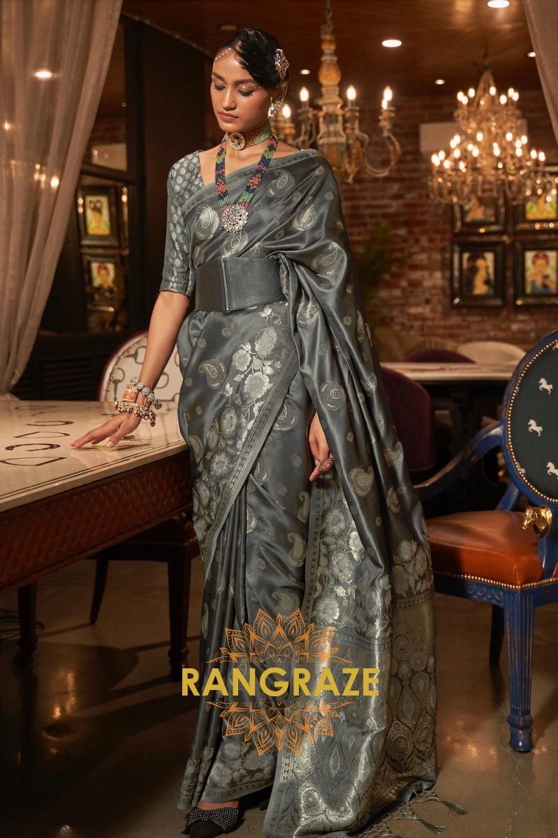 Grand Metal Grey Woven Banarasi Golden Zari Satin Silk Saree