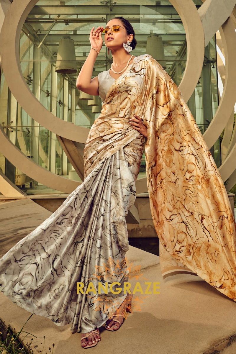 Illuminate your elegance with the Radiance Golden and Grey Satin Silk Printed Saree. This captivating...