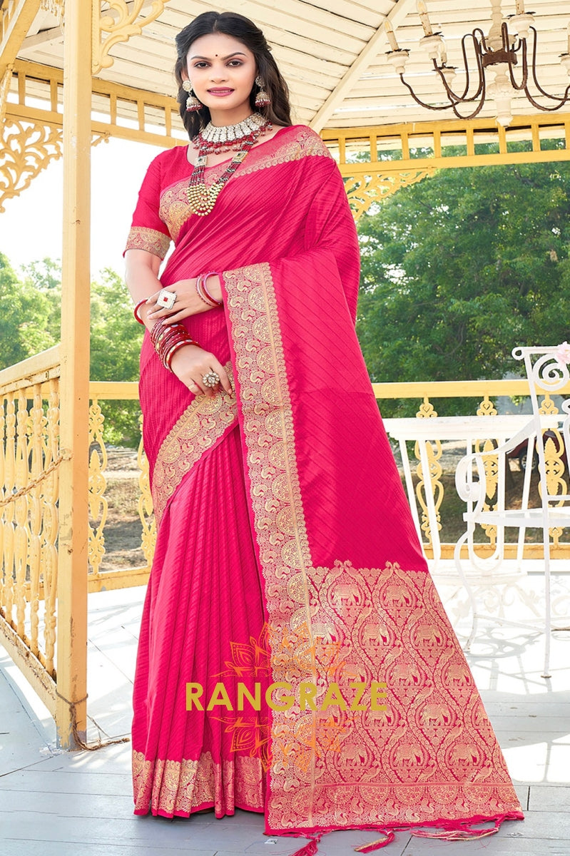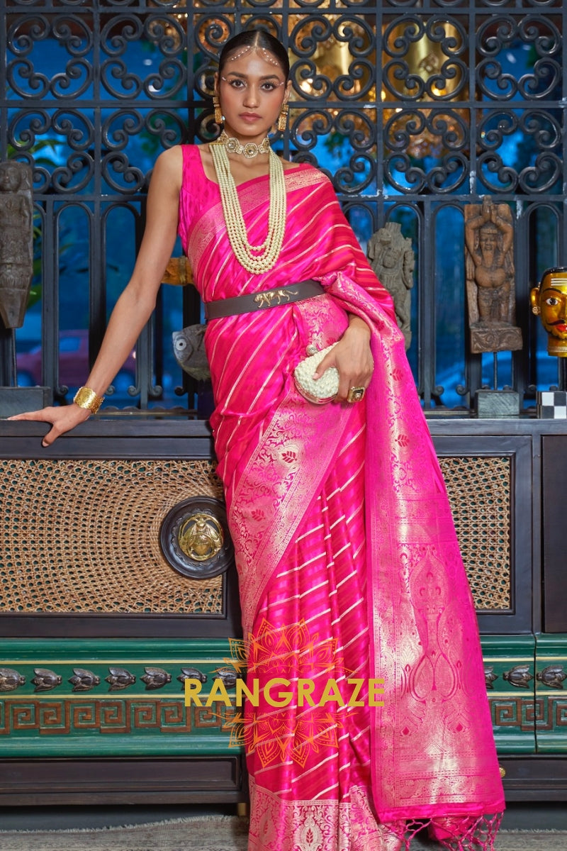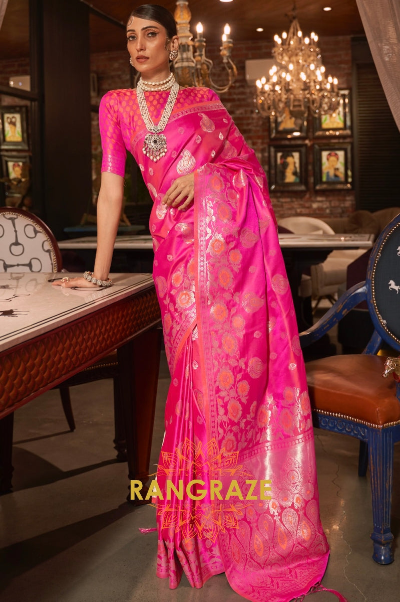 Magenta Pink Golden Zari Banarasi Silk Saree With Matching Blouse