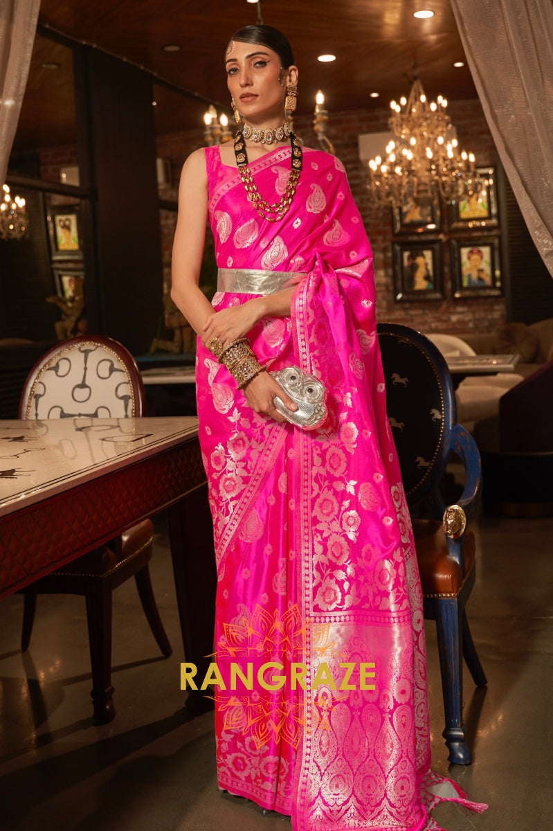 Magenta Pink Woven Banarasi Silk Saree With Gold And Silver Zari