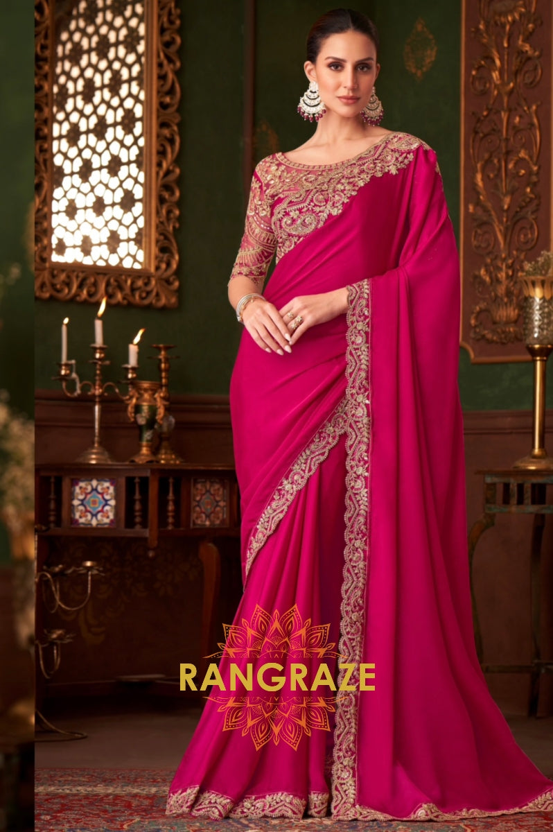Opulent Fuchsia Silk Saree with Exquisite Gold Embroidery