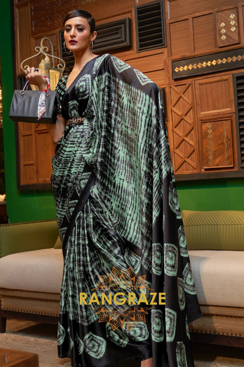 Green Black Stripes Satin Silk Printed Saree