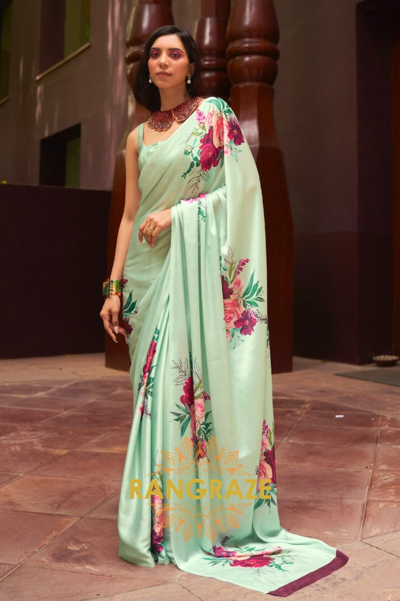 Light Green Floral Print Satin Silk Saree