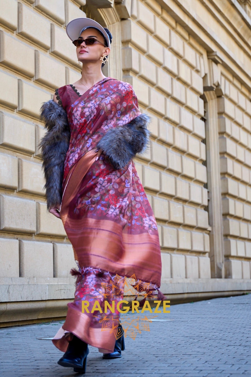 Orchid Garnet Red Floral Print Satin Organza Weaving Saree