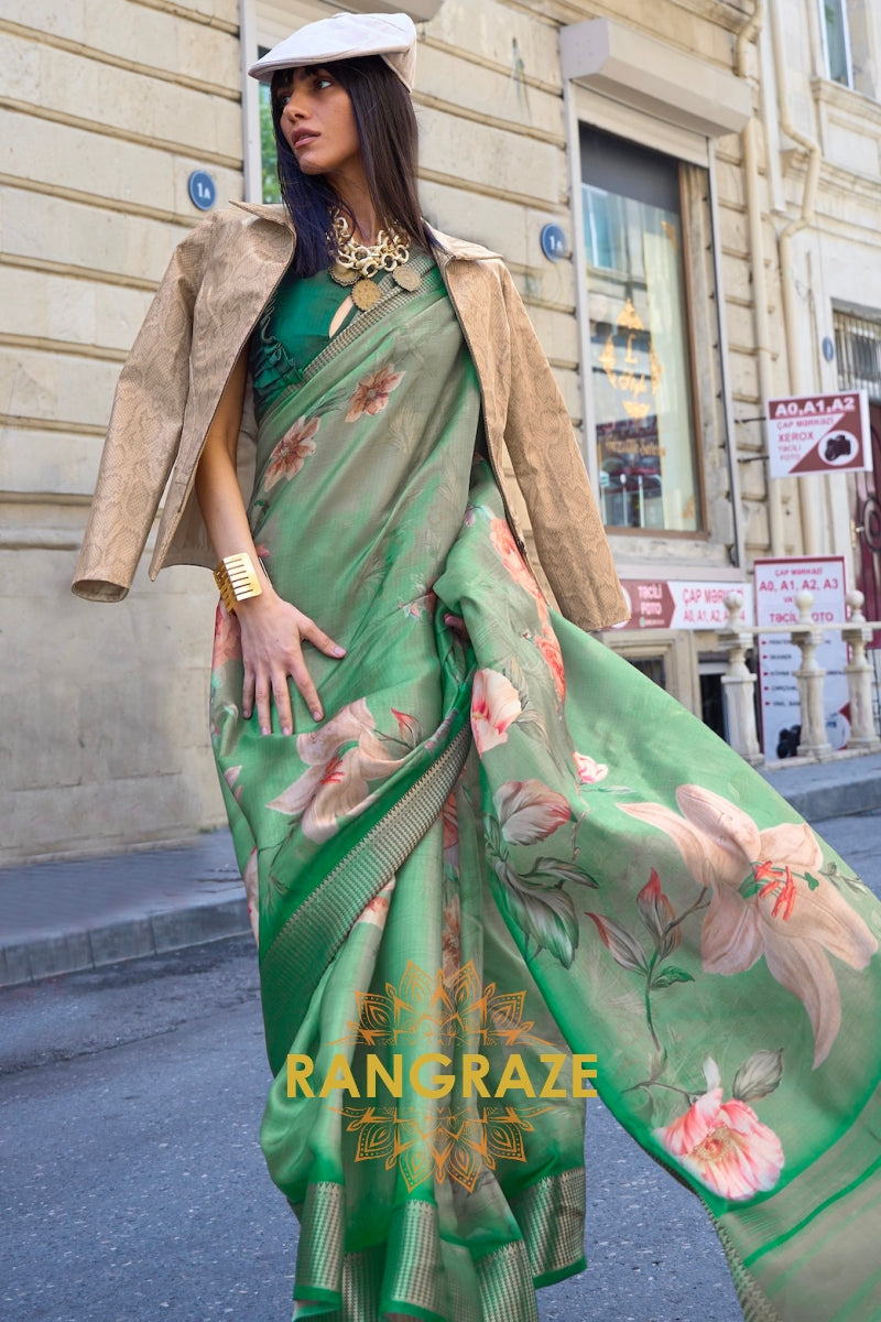 Orchid Green Floral Print Satin Organza Weaving Saree