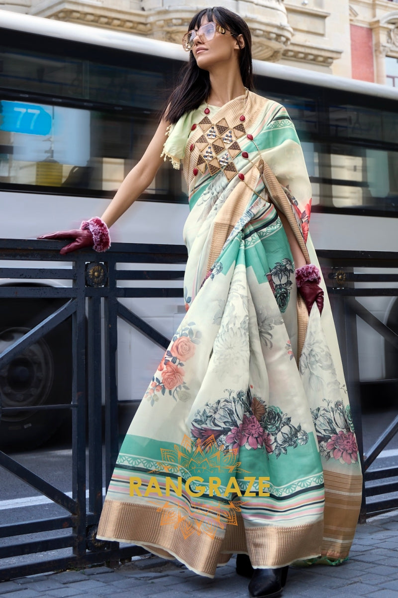 Orchid Sea Green Floral Print Satin Organza Weaving Saree