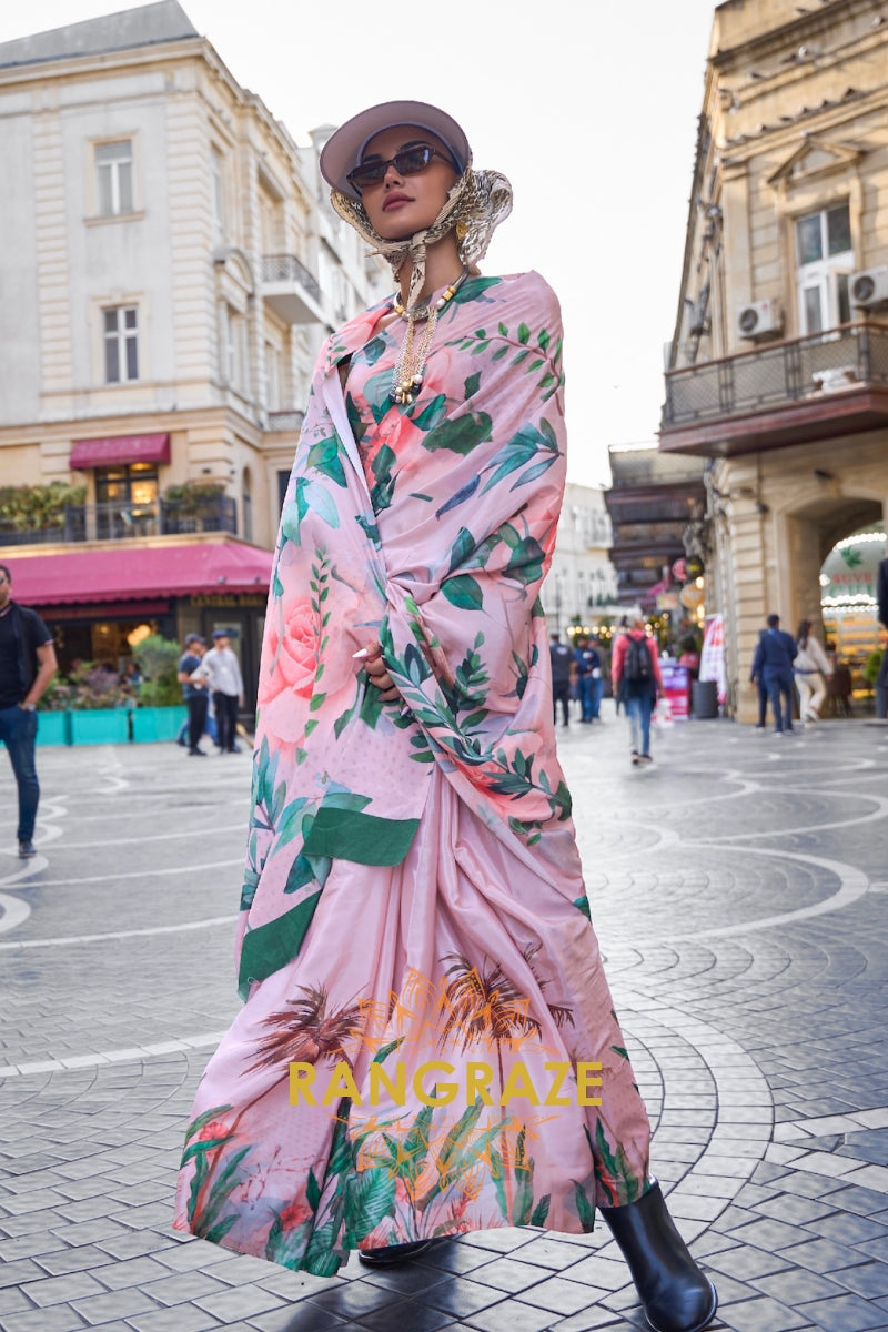 Baby Pink Floral Print Satin Silk Saree