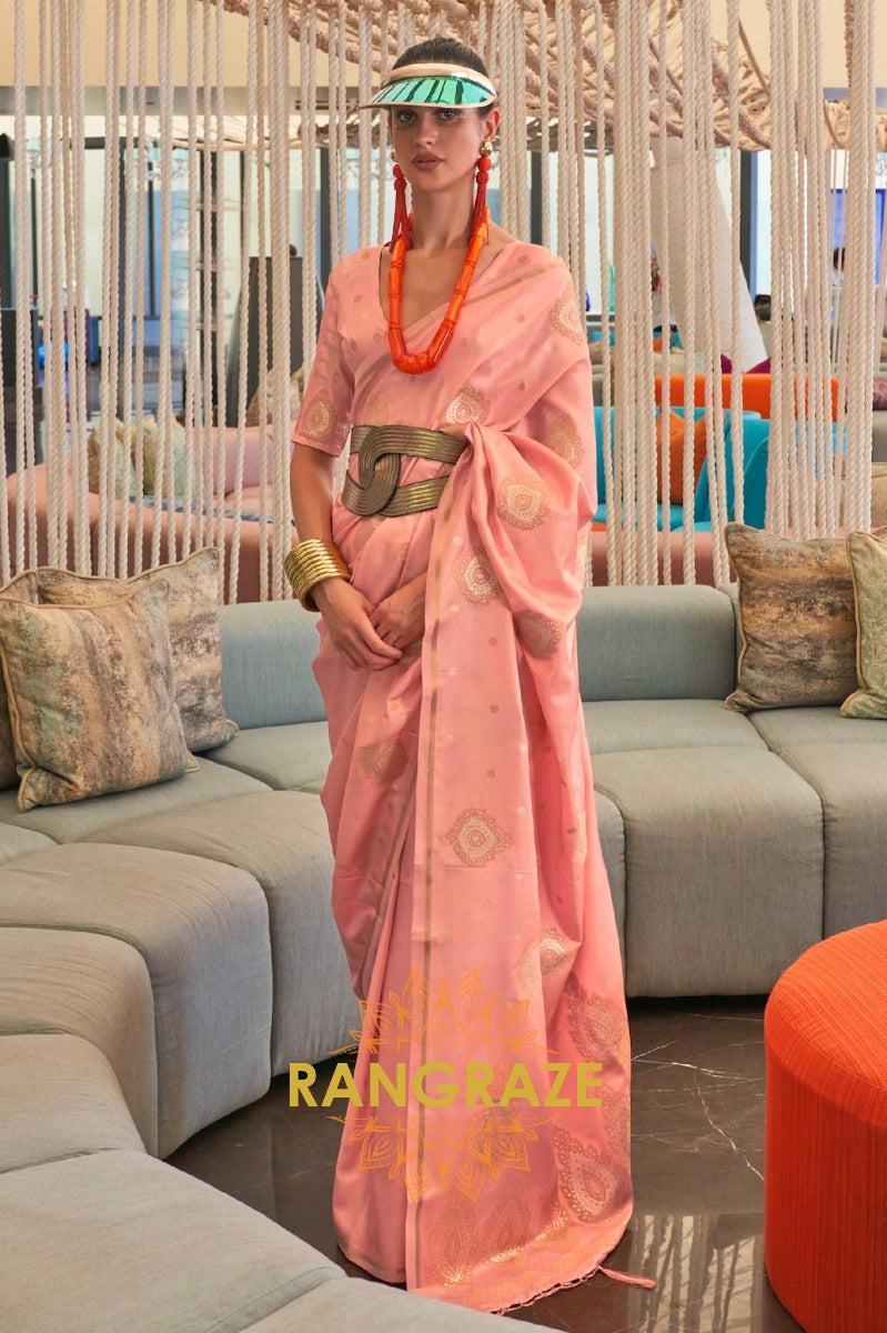 Peach Pink Mystic Woven Smooth Satin Silk Banarasi Saree