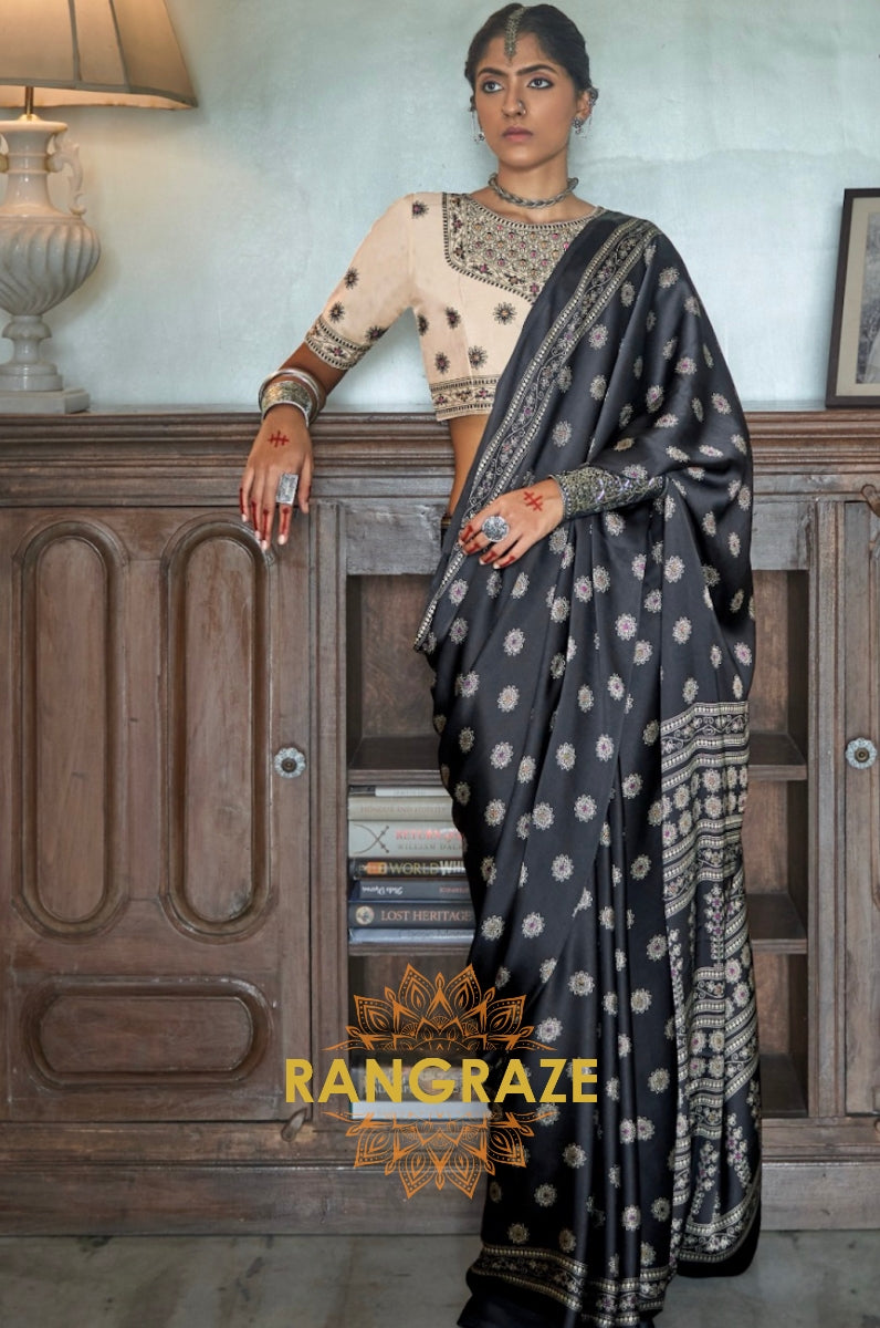 Classic Jet Black Satin Silk Ajrakh Print Saree