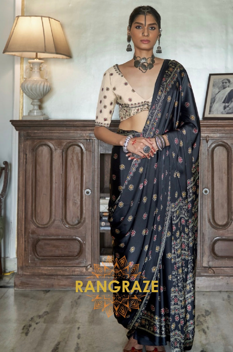 Floral Black Multi Shade Ajrakh Printed Satin Silk Saree