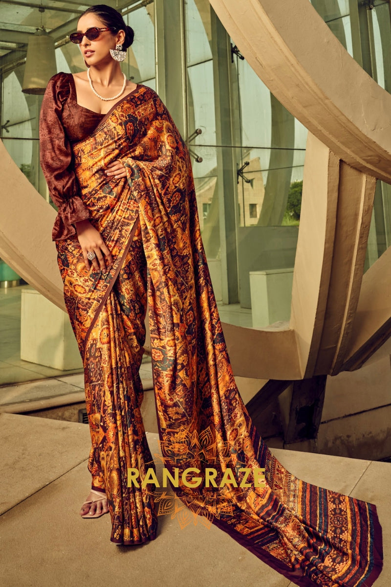 The Espresso Brown and Beige Printed Satin Silk Saree is a sophisticated and elegant choice...