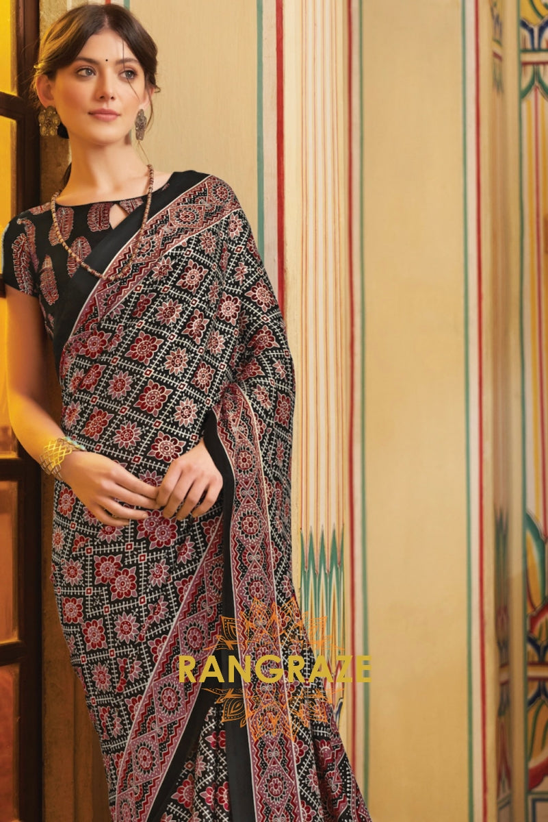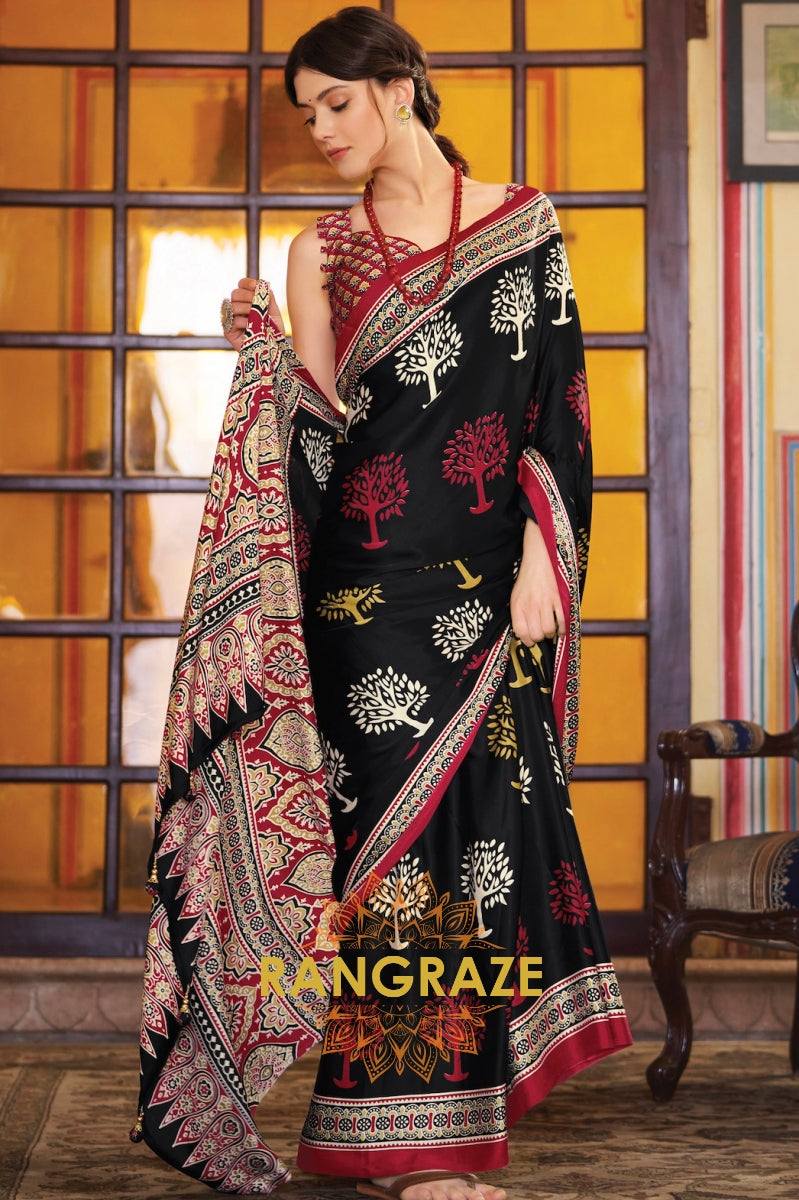 Black and Red Printed Ajrakh Printed Satin Crepe Saree