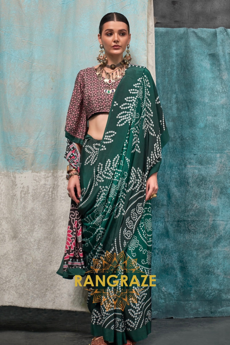 Emerald Green And Pink Bandhani Printed Satin Crepe Saree