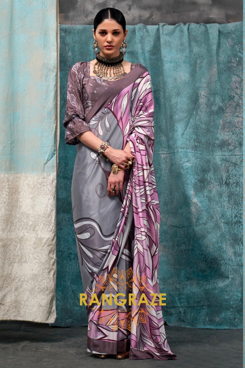 Lavender And Grey Abstract Printed Satin Crepe Saree