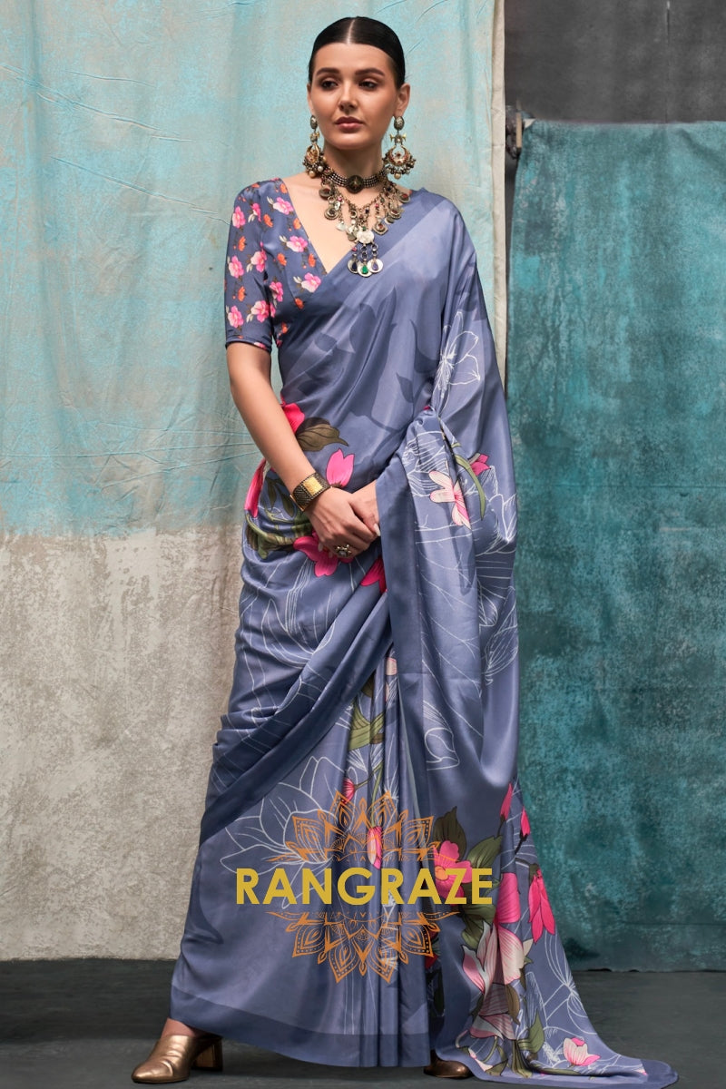 Dusty Blue And Pink Floral Satin Crepe Saree
