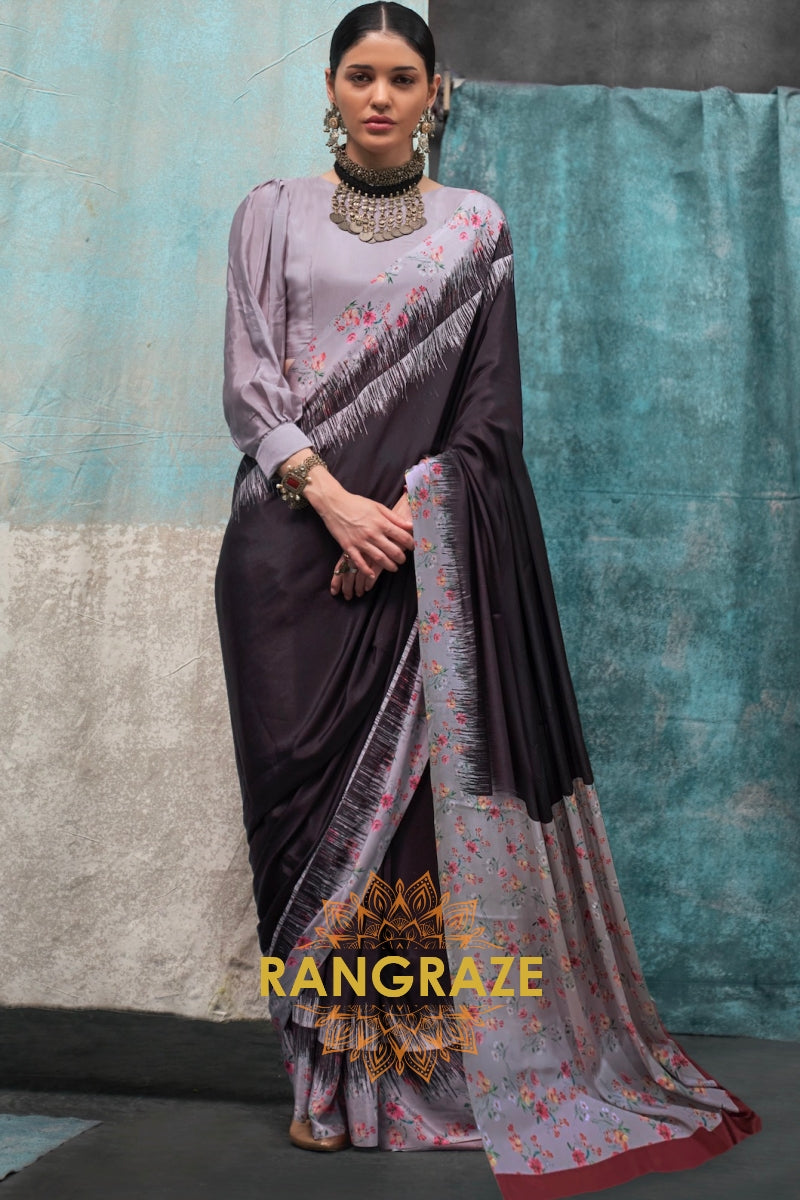 Lavender And Brown Satin Crepe Saree With Floral Accents