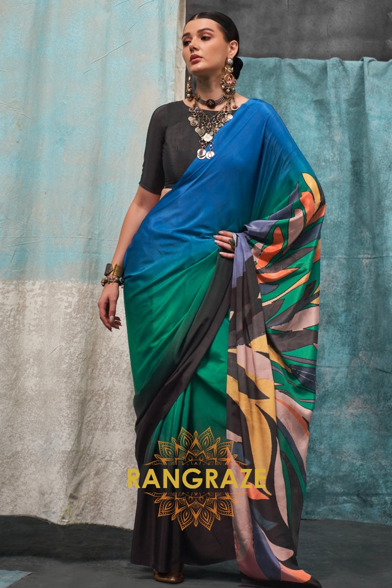 Discover the epitome of sophistication with this Elegant Blue and Green Printed Satin Crepe Saree....