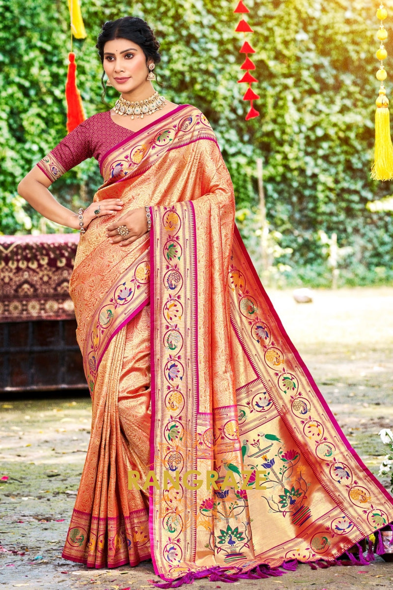 Peach Orange Paithani Silk Saree with Traditional Motifs