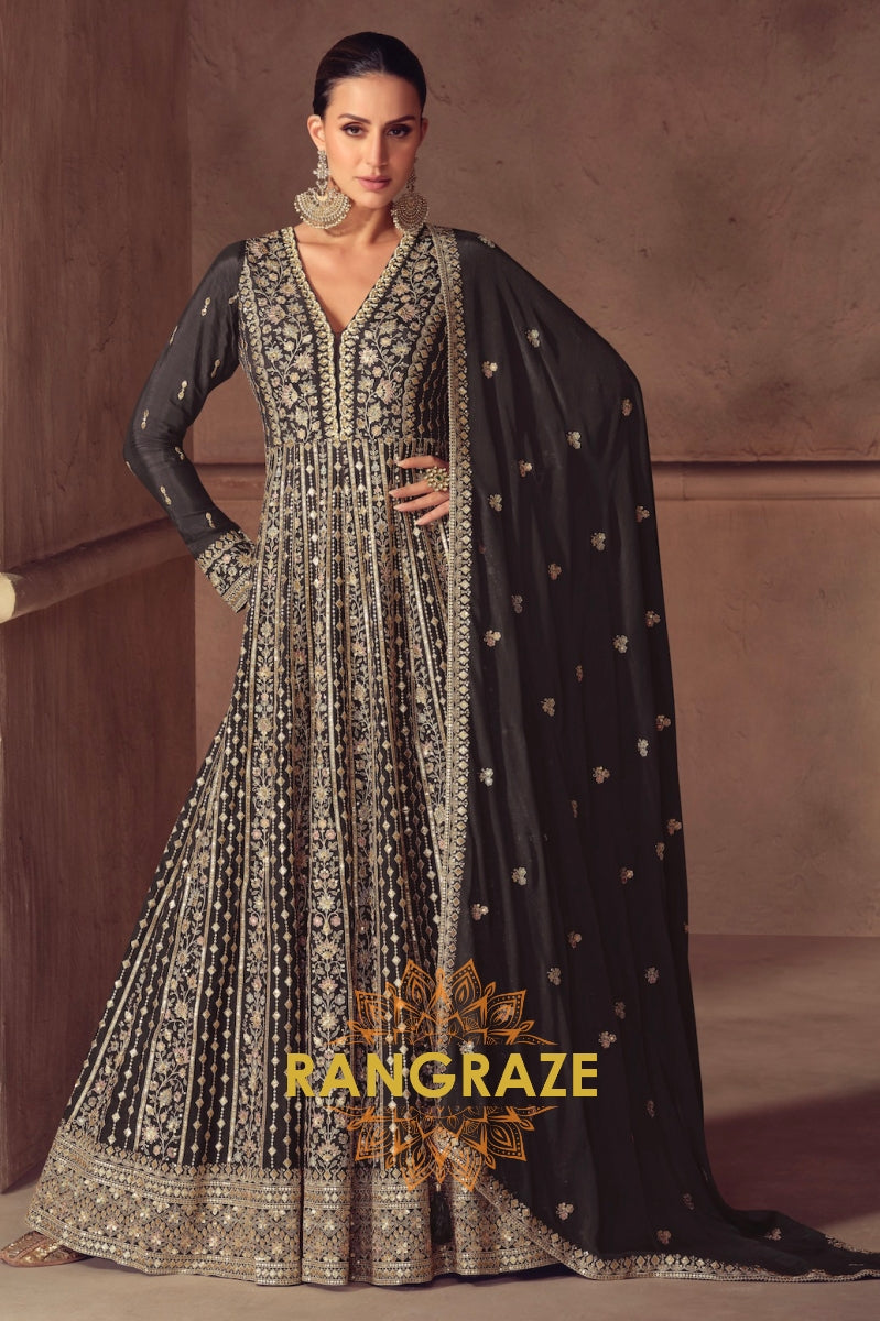 Noir Elegance Silk Embroidered Anarkali Suit Set
