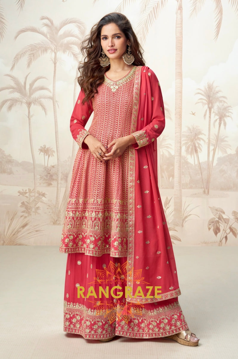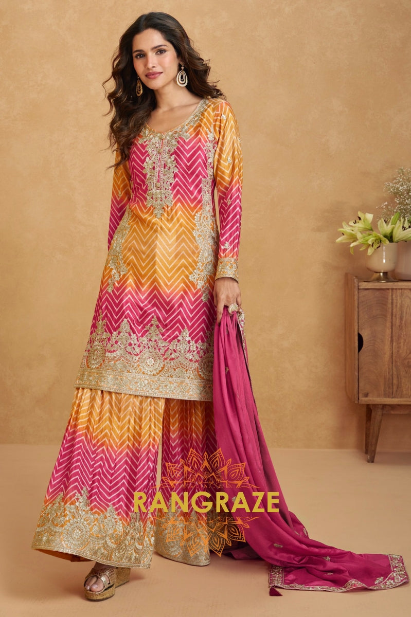 Make a bold festive statement with this radiant Pink & Orange Chevron Embroidered Sharara Suit...
