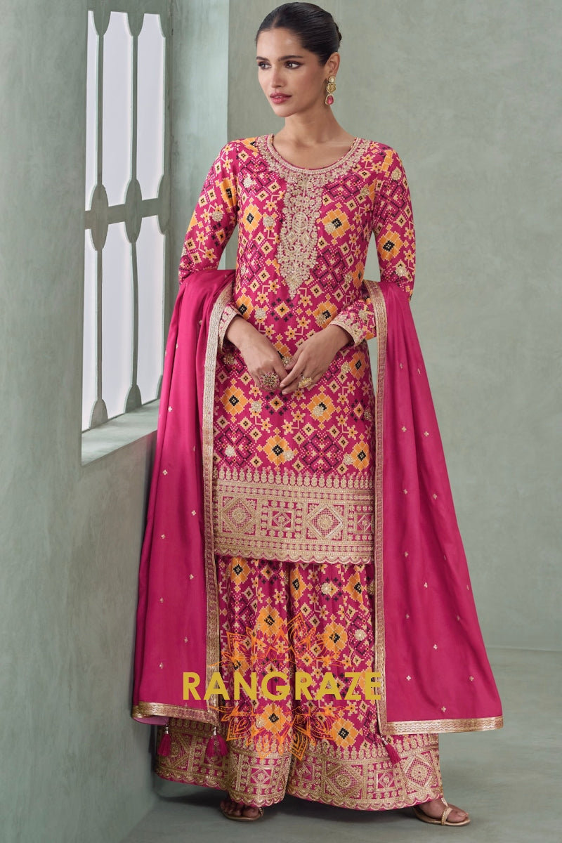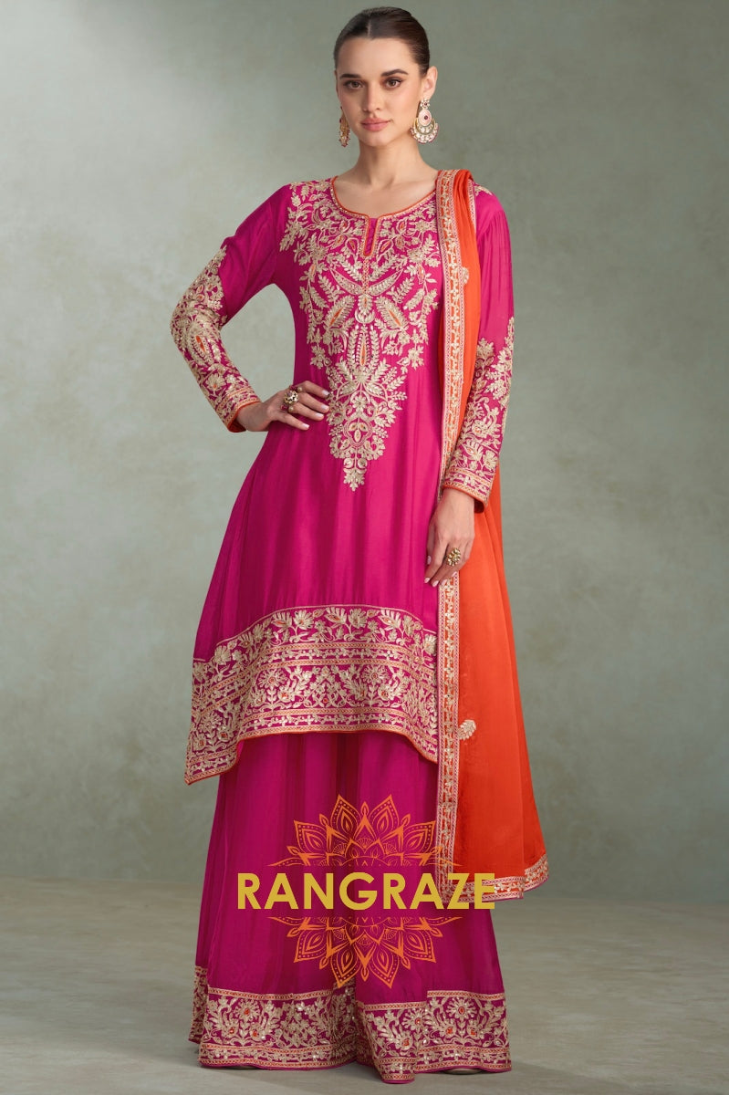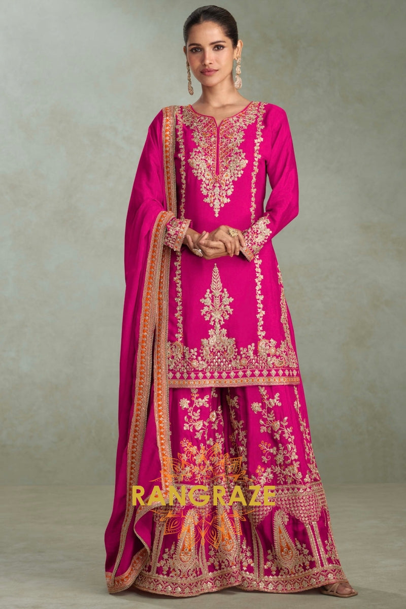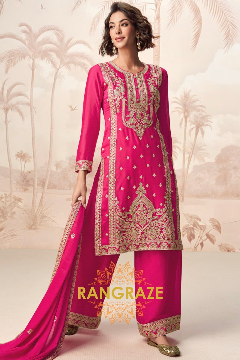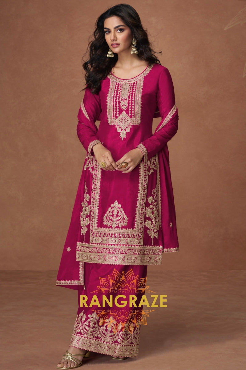 Radiant Rani Pink Embroidered Silk Palazzo Suit Set