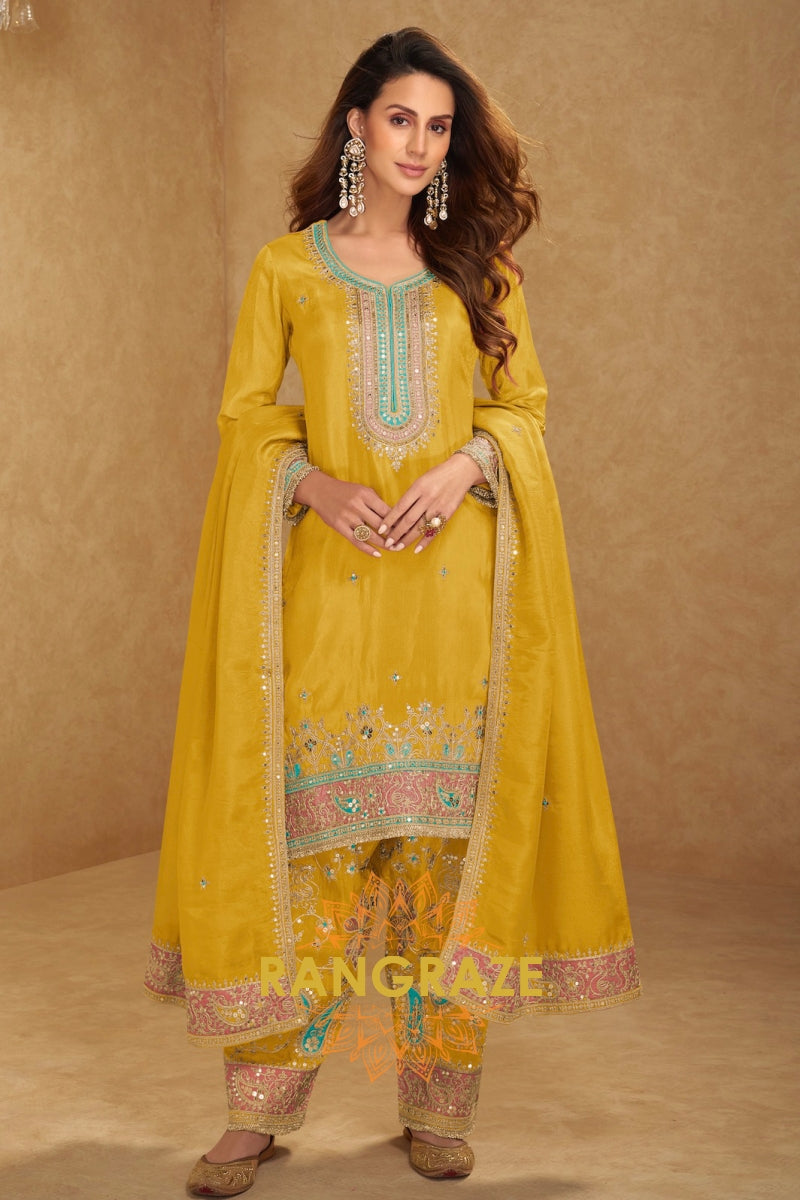 Step into timeless elegance with this Radiant Yellow Embroidered Chinon Silk Palazzo Set, a luminous...