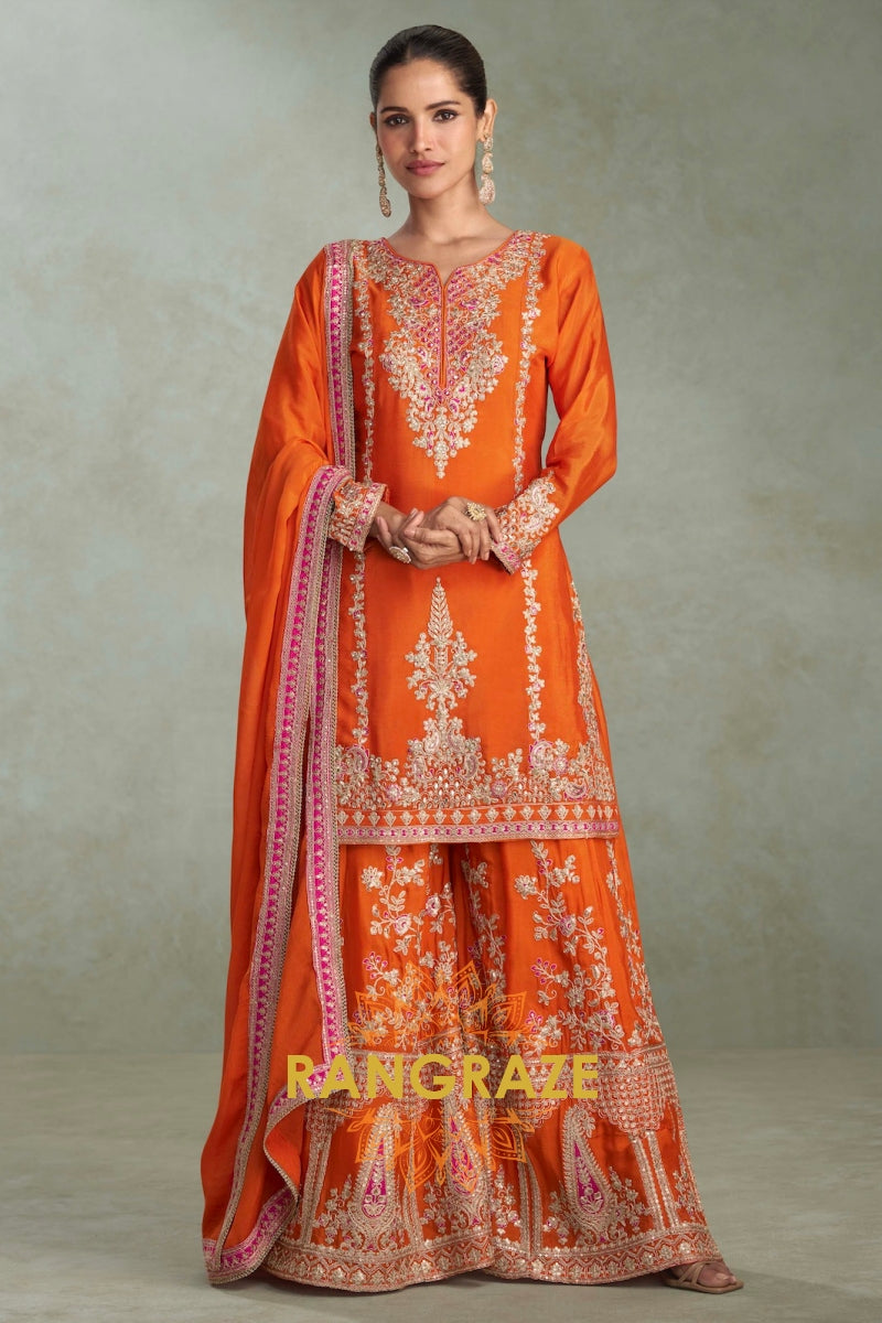 Brighten your festive wardrobe with this vibrant Orange-Yellow Sharara Suit Set. Crafted on premium Banarasi...