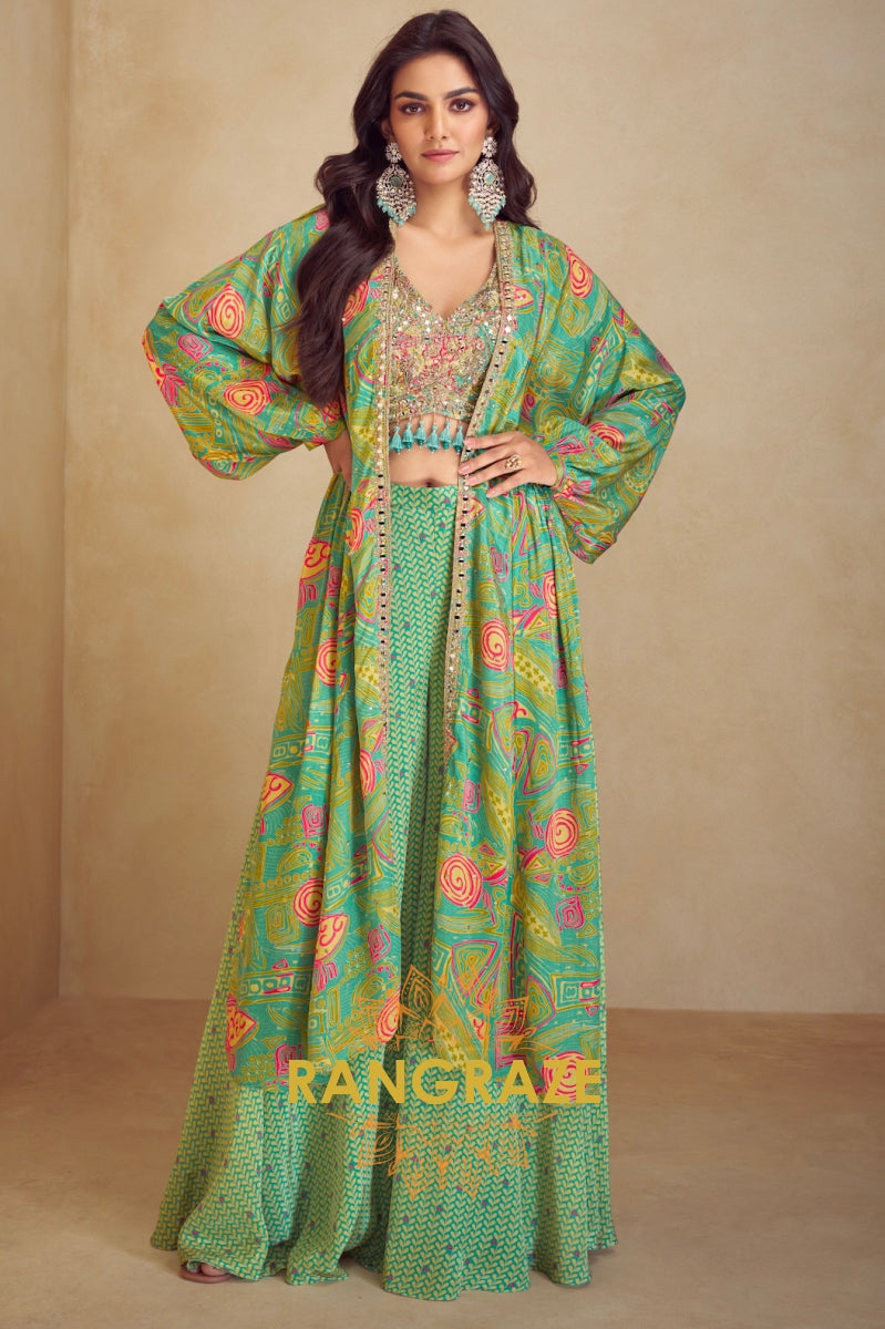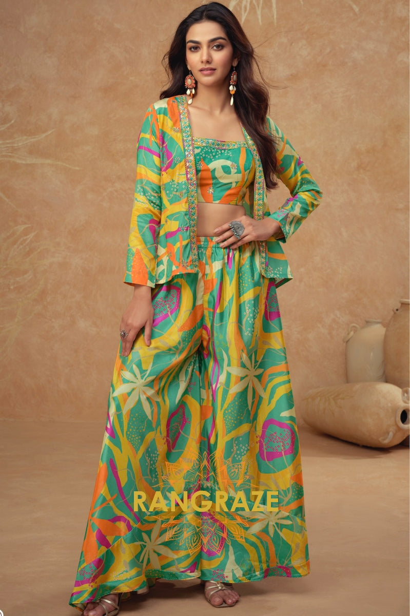 Semi Western Wear – Embroidered Crop Top with Printed Long Jacket and Palazzo Suit Set