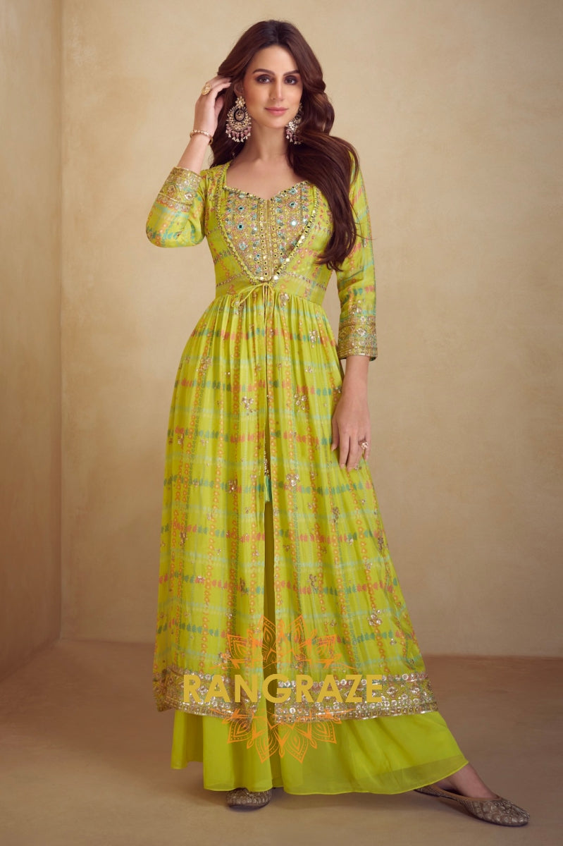 Lime Bliss Embellished Chinon Semi-Western Slit Jacket Suit Set