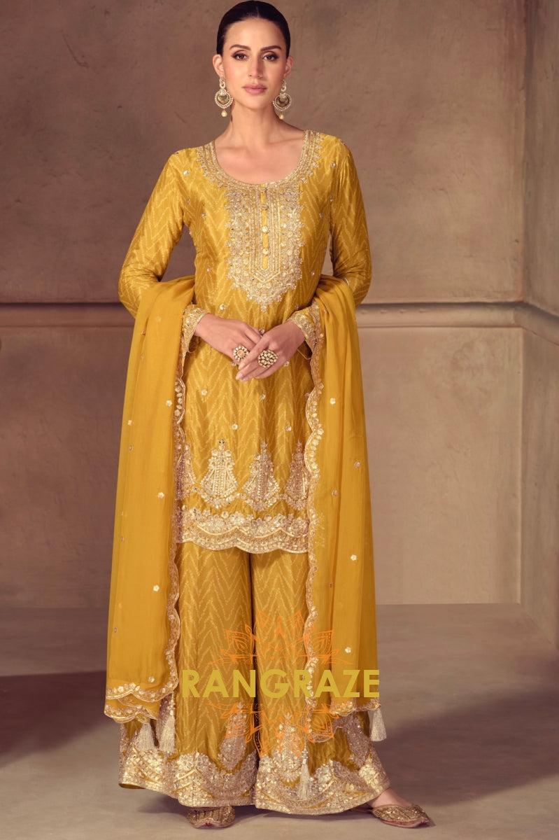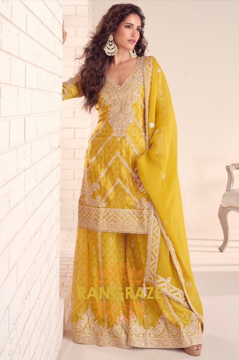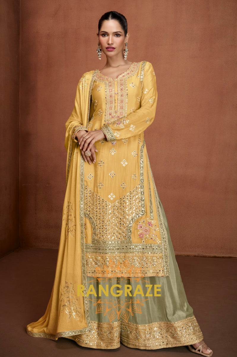 Radiate Festive Splendor in the Mustard Gold Chinon Embroidered Sharara Suit Set