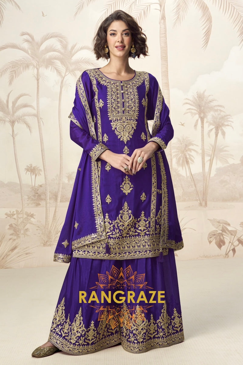 Regal Amethyst Chinon Silk Sharara Suit Set – 3-Piece Embroidered Kurta, Sharara & Dupatta