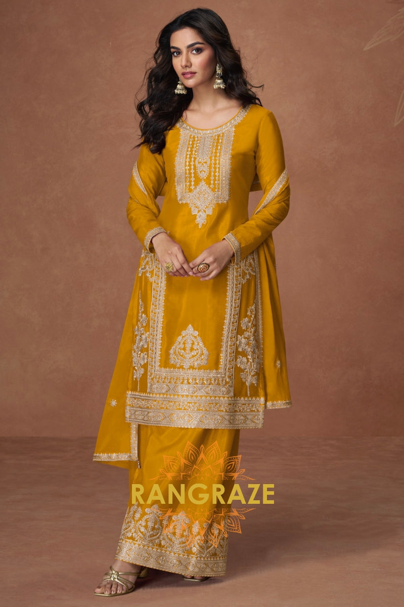 Illuminate your festivities with the regal charm of the Golden Radiance Embroidered Chinon Palazzo Suit...