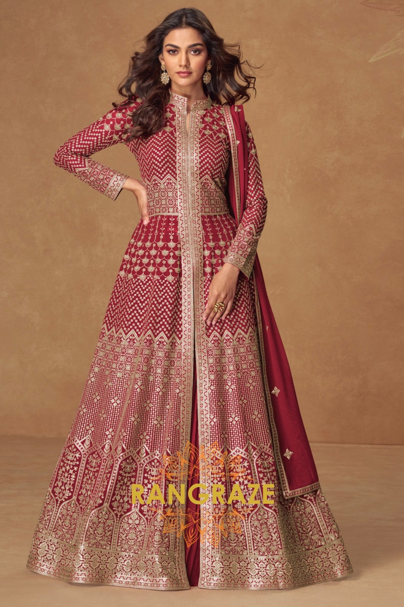Maroon Elegance Front-Open Embroidered Anarkali Suit Set