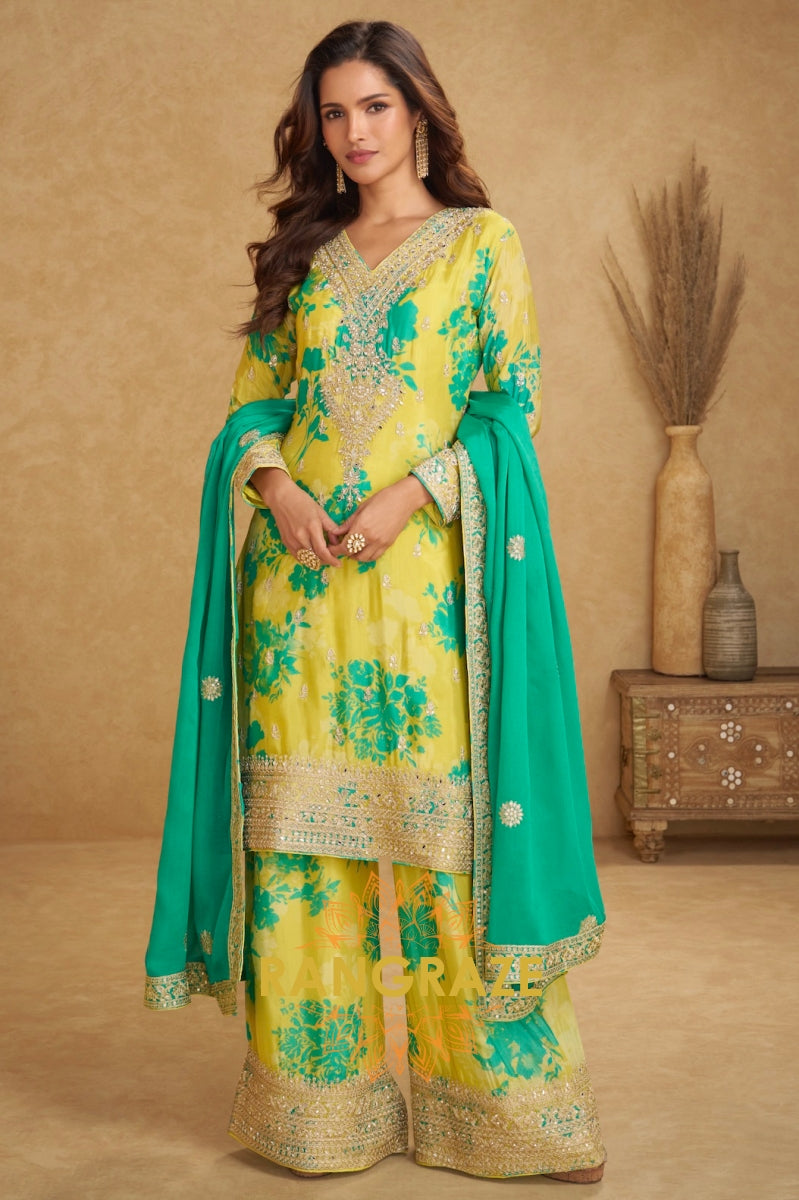 Radiant Lime Bloom Chinon Silk Suit Set – 3 Piece Embroidered Kurta, Palazzo & Dupatta