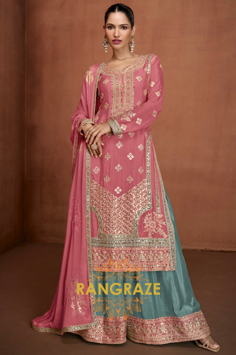 Elegant Pink & Teal Embroidered Silk Palazzo Suit Set